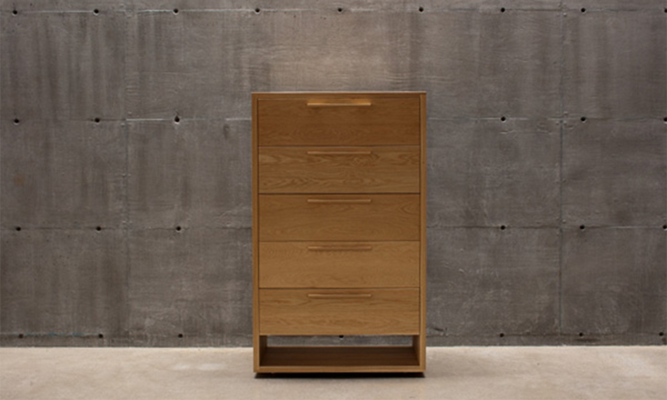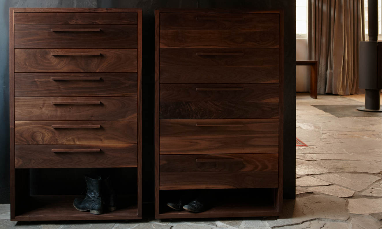 S107 est une grande commode en bois avec cinq tiroirs en érable massif à queue d'aronde et un espace de rangement ouvert à la base. Compacte sans sacrifier le rangement, cette commode est parfaite pour les petits espaces. Nous recommandons de la fixer au mur.